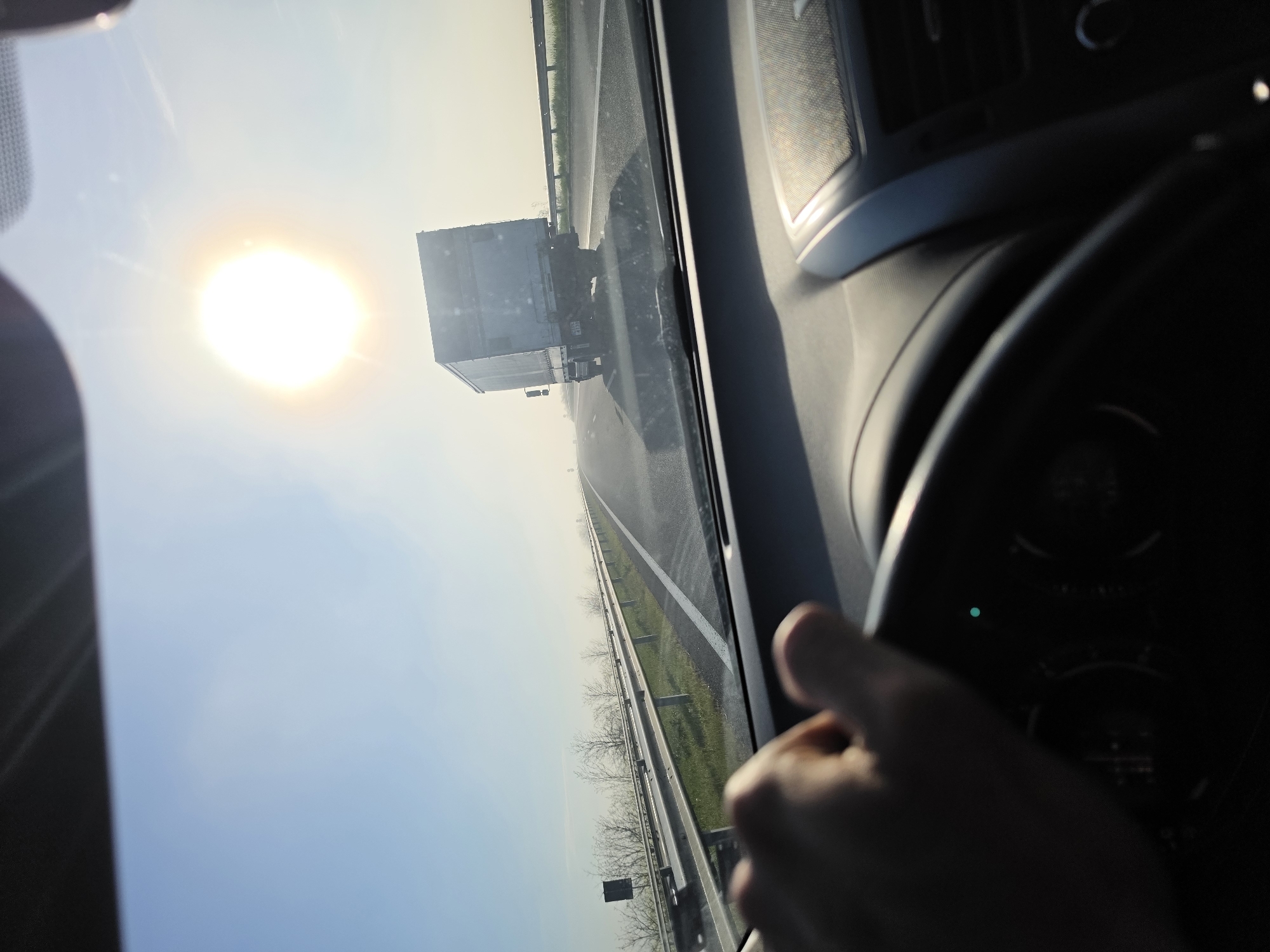 The image depicts a view from inside a vehicle moving on a highway. The sun is visible in the sky, partially obscured by a truck ahead in the same lane. The road is straight, with a metal barrier and vegetation alongside. The interior of the vehicle includes the dashboard and steering wheel, with a hand partially visible on the wheel. The location is unknown.