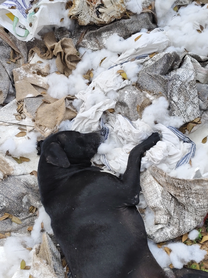 A black dog lies amid scattered trash. Burlap sacks, shredded white fabric, and loose white stuffing surround the dog. Dry leaves and small twigs are also present. The dog appears relaxed, resting its head on a crumpled white cloth. The trash and debris create a disheveled and abandoned scene.