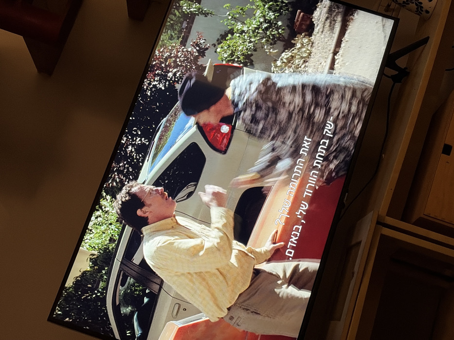 A TV screen displays a scene with two men near a car. One man in a yellow shirt appears surprised, his arms raised. The other man, wearing a dark beanie and a gray patterned top, leans towards him. Hebrew text is visible on the right side of the screen. The background features trees and a building. The TV is set on a wooden cabinet, with other objects nearby.