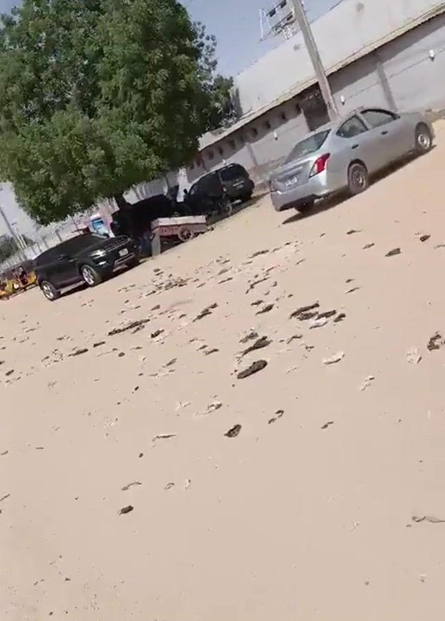 The video appears to show a street scene with various vehicles, including cars, a truck with a trailer, and several auto rickshaws (tuk-tuks). The ground is sandy and littered with debris. A few buildings and utility poles are visible in the background. The sky is clear and blue. The video also records the sound of loud wind.