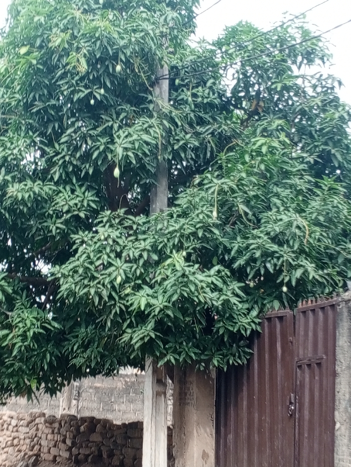 The image depicts an outdoor scene in Onitsha, Nigeria, featuring a large, mature tree with dense green foliage, likely a mango tree, bearing several light-green, elongated fruits. A concrete utility pole extends vertically through the center of the tree's canopy, with electrical wires visible near the top. To the right, a weathered, dark brown metal gate with vertical corrugated panels is partially visible, indicating an entrance to a property. Adjacent to the gate on the left is a light-colored concrete pillar, which appears to be part of a fence line. Below the tree on the left, a low wall constructed from rough, light-colored stones or bricks is present, with a grey concrete block wall situated behind it. The sky above is overcast, suggesting a cloudy day. No individuals, animals, or discernible actions are present in the frame.