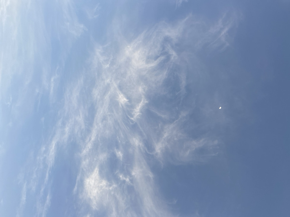 A bright blue sky with wispy cirrus clouds scattered across the frame. The clouds are primarily concentrated towards the center, creating swirling patterns. A crescent moon is visible in the lower right corner, adding a sense of depth and scale. The overall composition is light and airy, conveying a feeling of serenity.