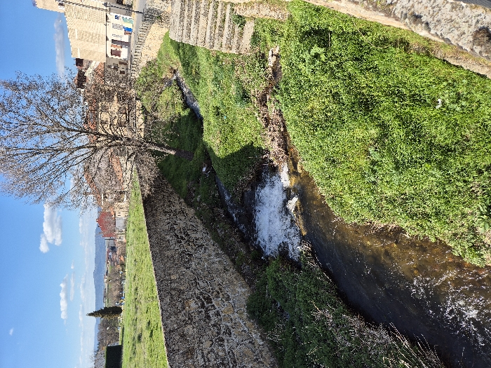 The image displays an outdoor scene in Piedrahíta, Spain, under a clear blue sky with scattered white cumulus clouds. A narrow, dark-bottomed stream flows from the foreground towards the midground, exhibiting clear, flowing water with a section of agitated, white-foamed water near the center-left. Both banks of the stream are densely covered with bright green vegetation, consisting of grass and small plants. To the left of the stream, a robust, irregularly coursed stone wall separates the watercourse from an expansive, verdant grassy field. Beyond this field, in the distance, a line of trees, a dark hedge, and gentle hills under the horizon are visible, alongside scattered red-roofed residential buildings. On the right side of the stream, a tall, leafless deciduous tree stands on the bank, casting a shadow. Immediately to its right, an elevated stone structure includes a visible set of stone steps descending towards the stream. Further into the midground on the right, a paved road or path runs parallel to the stream, bordered by a collection of buildings featuring light-toned facades and reddish-brown tiled roofs. The most prominent building on the far right is a substantial, light-colored structure with thick walls and what appear to be buttresses, consistent with a historical fortress or castle architecture, overlooking the stream and the town. No individuals are present within the frame.