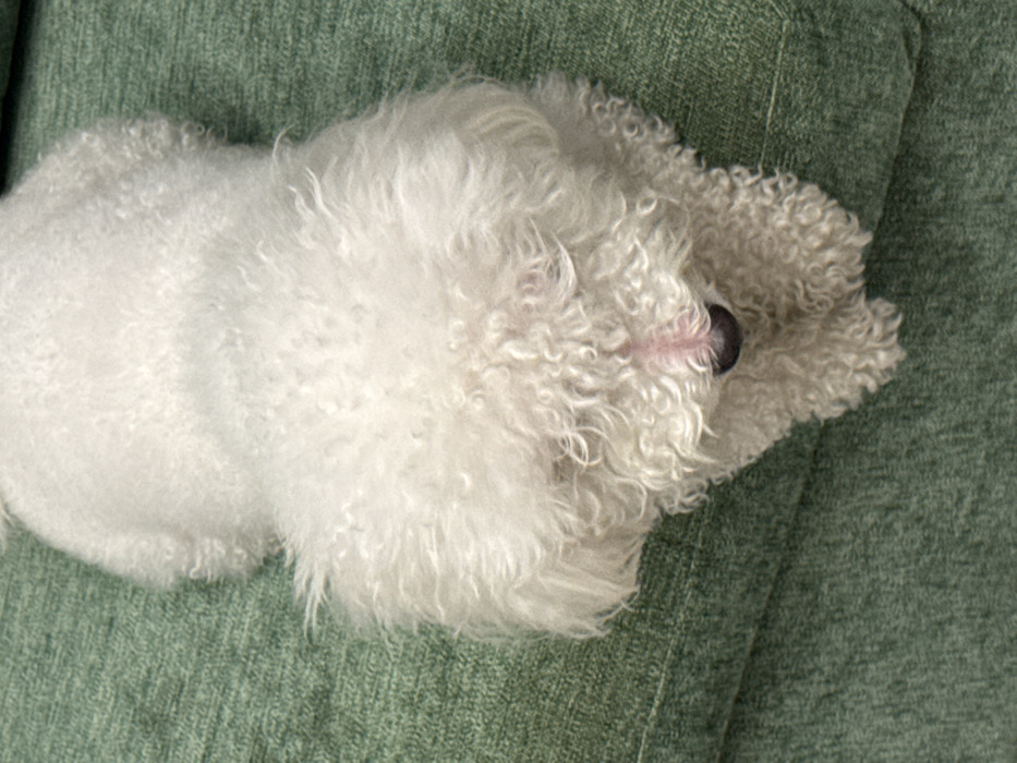 - "A white, curly-haired canine, consistent with a Bichon Frise or similar breed, is depicted lying prone on a textured green upholstered surface" by FM-AtE073, licensed under CC BY 4.0