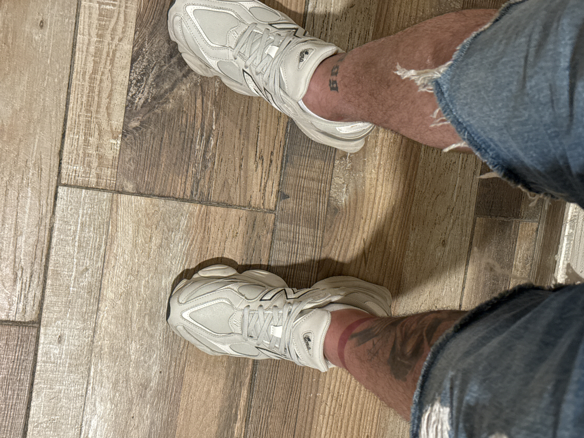 first-person perspective looking down at a person's legs and feet. The person is wearing ripped denim shorts and white New Balance 9060 sneakers. The location appears to be indoors on a floor covered with wood-look ceramic tiles. There is no information indicating the specific location in Knjazevac Municipality, Serbia. The subject's left ankle has a tattoo, while the right leg has a red mark around the ankle.