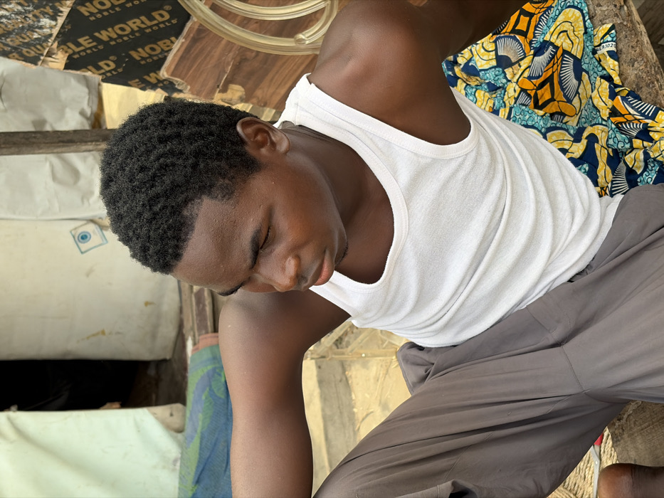A dark-skinned man is seen wearing a white tank top and gray pants. He has short, dark hair with a distinct hairline and his eyes are closed. He appears to be either looking down or possibly sleeping. The background is cluttered with various items, including cardboard boxes with the words "NOBLE WORLD" printed on them, a gold-colored metal object, and a piece of colorful fabric. The scene suggests an indoor or sheltered environment.