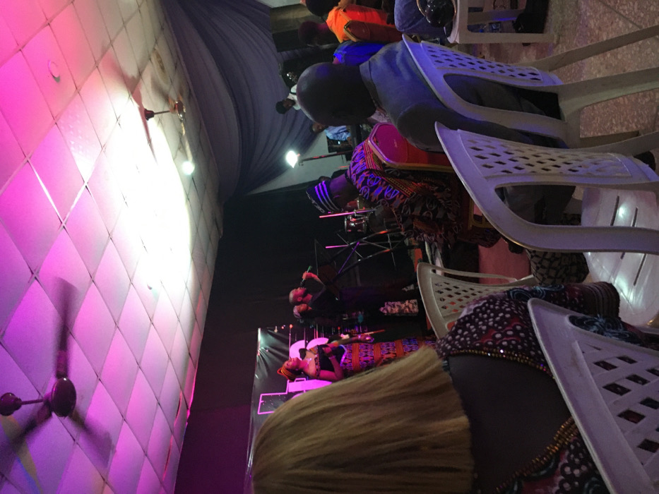 This image depicts an indoor event occurring in Barakin Lerawi, Nigeria. The scene is illuminated by prominent purple and pink ambient lighting from the ceiling, which features white square acoustic panels and two ceiling fans, one visibly rotating. A stage area is set against a black backdrop, with purple draped fabric visible to the right. In the foreground, the backs of two audience members are visible. On the left, a person with short, blonde hair wears a patterned garment with beaded detail, seated in a white plastic chair. On the right, another individual with a dark, short haircut or bald head wears a light-colored top, also seated in a white plastic chair. On the stage, several individuals are performing. A female performer, positioned left of center, wears a patterned off-shoulder dress and a headwrap, holding a microphone. To her right, two male performers are visible, one holding a microphone. Stage equipment, including multiple microphone stands, speakers, and a white spotlight on a stand, is present. Further to the right on the stage, a male individual wearing traditional Nigerian attire—a dark blue patterned garment and a matching cap—is seated in a reddish-pink chair, looking downwards. Other audience members or personnel are visible in the background, some seated in white plastic chairs, and one person appears to be at a keyboard. The floor is light-colored and tiled.