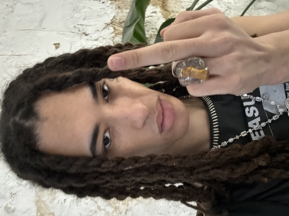 A person with long dreadlocks stares provocatively at the camera, their face slightly angled. They wear a ring on their middle finger, which is extended in a rude gesture. A necklace adorns their neck, paired with a black shirt bearing the word "EASU." A partial view of a plant is seen in the background. The background behind the subject is a textured white wall.
