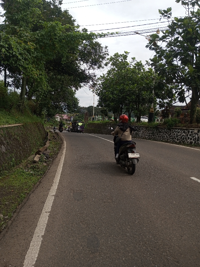 The image displays a two-lane asphalt road curving to the left in Kodarapalli, India, under an overcast sky. In the foreground, a solid white line marks the right edge of the road, bordered by a dirt and grass shoulder. A partially collapsed stone retaining wall runs along the left side of the road, with remnants of concrete blocks and vegetation. In the midground, a person wearing a red helmet, a light-colored long-sleeved top, and dark pants is riding a dark scooter away from the camera. The scooter's license plate reads "F 4569 WDB" and "03-24". Ahead on the road, multiple other motorcycles and a purple three-wheeled vehicle are visible, traveling in the same direction. To the right of the road, a low retaining wall constructed of patterned dark and light stones supports an elevated section lined with numerous green trees and decorative streetlights featuring golden, ornate tops. The background consists of dense green foliage from various trees on both sides of the road. Overhead, utility lines are visible against a bright, cloudy sky. Faint outlines of distant structures are discernible through the trees.