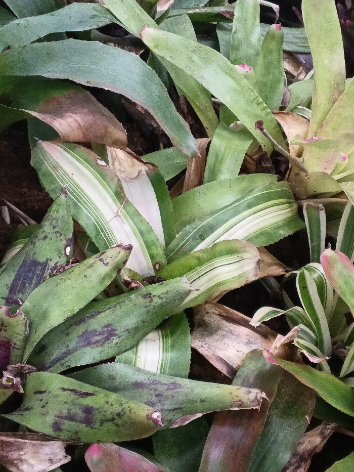 An assortment of bromeliads fills the frame, showcasing varied leaf patterns. Some leaves are solid green, while others exhibit stripes of green and white. Dark purple or black markings appear on some leaves, and a few display pinkish or reddish tinges at the tips or edges. Several leaves are browning and appear dried.
