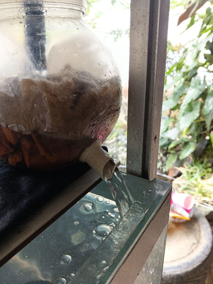 In Sarandi de Cuadra, Uruguay, a close-up, outdoor scene depicts a clear, roughly spherical glass jar functioning as a water collection or filtration system. The jar is approximately 30-40 cm in diameter and contains a dense, brownish, fibrous material partially submerged in liquid, along with some darker, reddish-brown fragments at the bottom. A short, light-colored spout, about 3 cm in length, is attached to the lower side of the jar, from which a continuous stream of clear water flows downwards. The water stream impacts a horizontal, dark-toned, reflective surface positioned directly beneath the spout, creating numerous visible water droplets and small bubbles on its surface. To the right of the jar, a vertical, dark metal structural beam is visible, exhibiting some surface wear. The background shows an outdoor environment characterized by lush green foliage and plant life. In the lower right background, a dark, cylindrical object, possibly a tire or barrel, is partially visible, alongside a bright pink plastic cup or container. No individuals or animals are present in the frame.