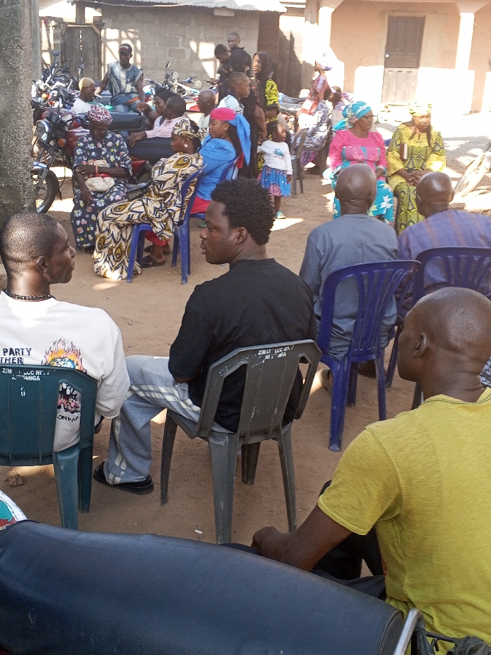 The image captures an outdoor social gathering in Akwanga, Nigeria, under bright daylight