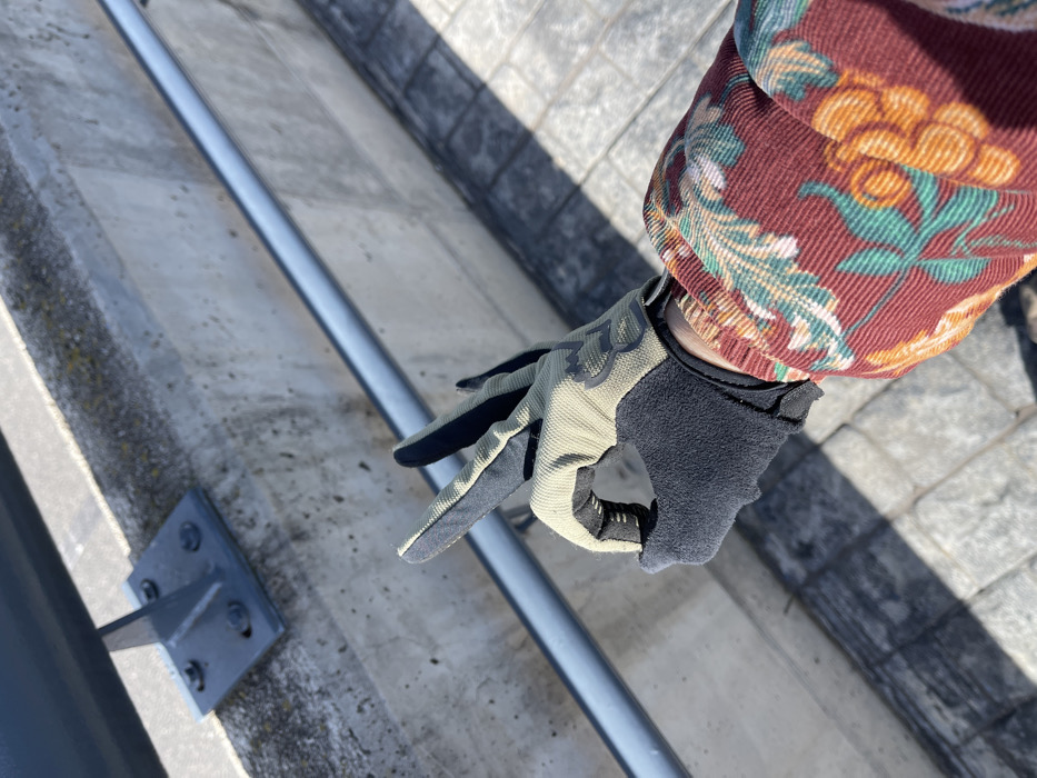 The image displays a close-up, downward-angled view of a person's right arm and hand in Altafulla, Spain. The hand, encased in a two-toned glove (black palm and inner fingers, light olive green/khaki back and outer fingers with a black Fox Racing logo), performs an "OK" gesture with the thumb and index finger forming a circle and the remaining three fingers extended upwards. The visible sleeve of the person's garment is a red/maroon corduroy fabric patterned with green leaves and orange/yellow fruits. In the background, a concrete structure serves as a barrier or railing. A dark grey metal railing is secured to the top of this concrete with a grey metal bracket and four bolts. Below the hand, a thinner, light grey horizontal metal bar is attached to the lower section of the concrete wall. The ground beyond the concrete structure is paved with light-colored square or rectangular pavers. Strong sunlight illuminates the scene, casting distinct shadows from the hand and the concrete structures onto the pavement.