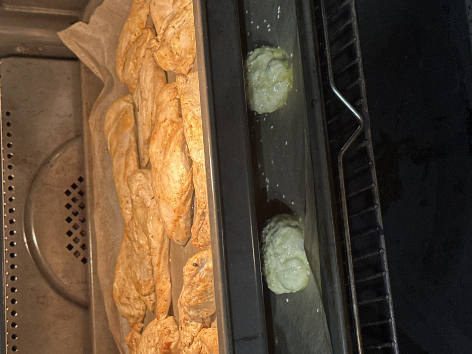 Within an oven in Pernik, Bulgaria, two baking sheets are visible on separate racks. The upper baking sheet, lined with parchment paper, holds numerous pieces of seasoned poultry, likely chicken breasts or tenders, which exhibit partial browning. The lower baking sheet, also lined with parchment paper, contains two raw or partially baked, round dough items, generously coated with sesame seeds and brushed with a glistening liquid, possibly oil or an egg wash. The oven interior features metallic walls and a visible vent at the rear of the upper section. A metal oven rack is discernible beneath the lower baking sheet.