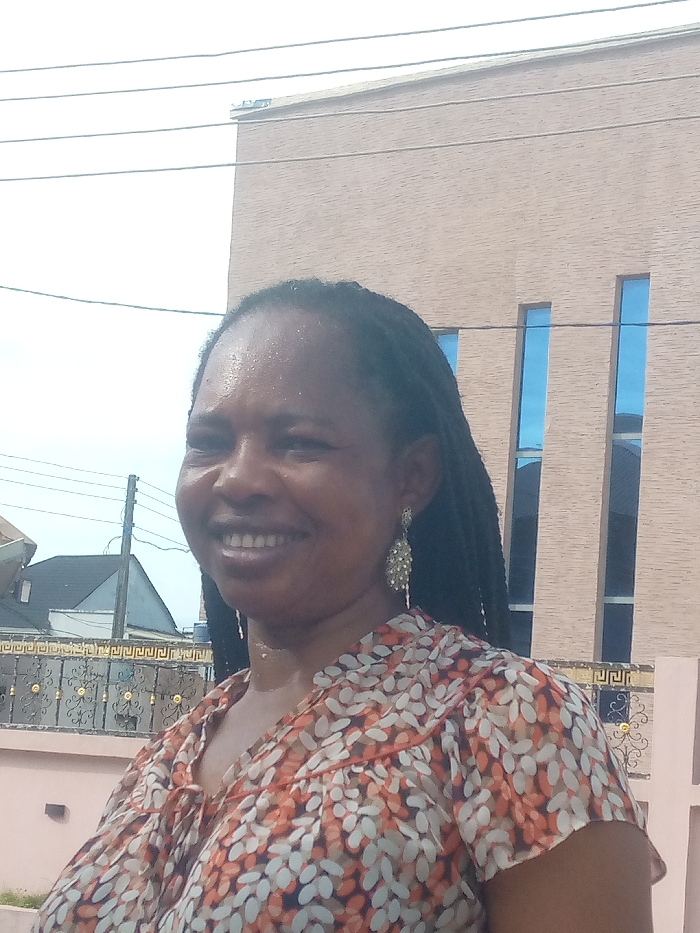 An adult female is depicted outdoors in Iranla, Nigeria, smiling toward the camera