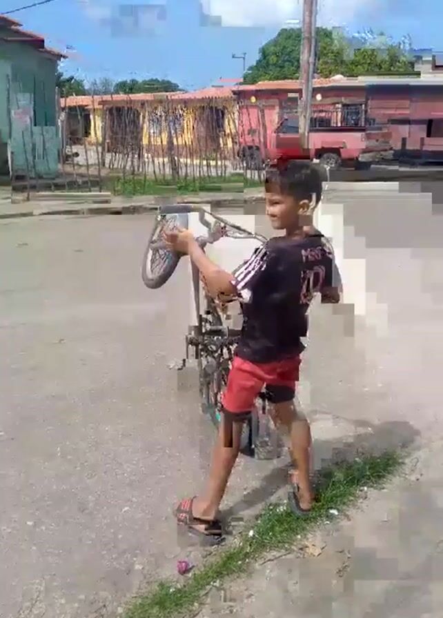 A boy in a black and red shirt and red shorts is standing on a street holding a bicycle vertically in front of him. The bicycle is facing away from the camera. He is wearing flip-flops. There are houses and a red truck in the background. In the next scene, a boy in a blue shirt, black shorts, and flip-flops is sitting on a blue bicycle near a chain link fence covered in foliage. He is looking at the camera and talking.