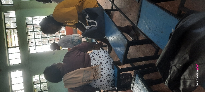 The scene depicts an interior view, likely a waiting area or office within a police station or similar government building, identified as "police kombo," in an unknown city in Kenya. The room features pale green-painted walls and a reddish-brown floor. Natural light illuminates the space through high rectangular windows fitted with dark metal grates. In the foreground, a dark blue metal bench is visible, with a folded black jacket or coat resting upon it. To the left, a woman is seated on a similar blue bench, observed from behind. She wears a dark long-sleeved top, a white skirt adorned with dark polka dots, and a patterned beige shawl draped over her left shoulder. Adjacent to her on the right, a second woman is seated on another blue bench. She wears a yellow top and is seen interacting with a dark blue tote bag featuring white rope handles, which rests on the bench beside her. She wears light-colored sandals. Further in the background, a third individual, possibly male, is seated in profile, wearing a light-colored shirt and looking to the left. A fourth person's head is partially visible on the far right edge of the frame. All visible individuals are seated; no direct interactions between them are discernible.