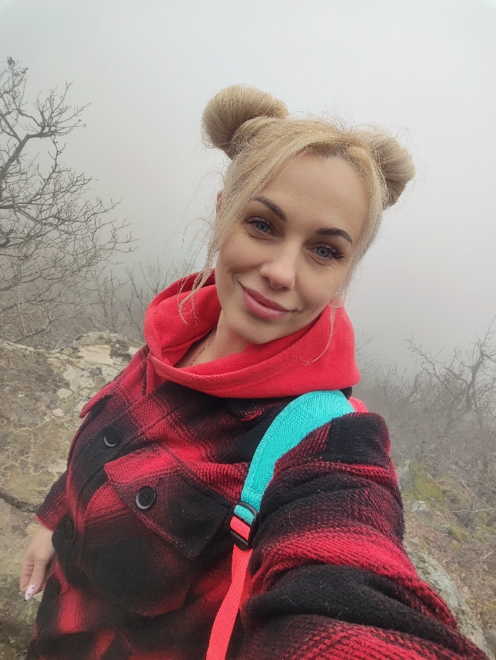 A female subject, appearing to be an adult with blonde hair styled in two prominent buns and fair skin, is depicted in a medium shot, likely a selfie. She has light blue eyes and a subtle smile. She is wearing a red hooded sweatshirt underneath a black and red plaid flannel-style jacket with two visible chest pockets and dark buttons. A backpack's turquoise strap with a red adjuster is visible over her right shoulder. The background is an outdoor, natural environment characterized by dense fog obscuring distant details. Bare deciduous tree branches are visible through the mist, suggesting a cooler season. The subject appears to be standing on uneven, rocky ground, possibly a hillside or mountain path, with patches of moss visible. The scene is consistent with a natural, elevated landscape located in or near Partenit, Ukraine.