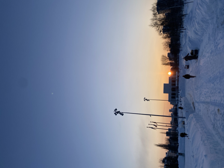 The image presents a wide view of Teatralny Square (Opera Square) in Perm, Russia, during winter, observed at either sunrise or sunset. The sky displays a gradient, transitioning from a deep azure blue at the top to warm orange and yellow hues near the horizon. A faint, small white circle, possibly the moon, is visible in the upper left quadrant of the sky. The entire ground is covered in a thick layer of white snow. A wide, well-trodden pathway, marked by footprints, extends from the foreground into the mid-ground, bordered by substantial snowbanks on both sides. Bare deciduous trees are scattered throughout the park area, particularly on the right side, with darker silhouettes of urban buildings visible in the distant background. In the mid-ground, slightly to the left of the prominent solar disc, stands the Perm Opera and Ballet Theatre. This structure is a large, multi-story building with a light-colored facade featuring a colonnade. The sun, a bright orange circle, is positioned just above the horizon, to the right of the theater. Two tall, multi-headed floodlight poles are visible; one stands prominently on the left side of the path, and a shorter one is to the right. Four vertical flagpoles are arrayed near the left floodlight pole. Approximately six individuals are present in the scene. Two figures are positioned on the far left, walking in the snow. One person walks alone on the main pathway, moving towards the sun. Another individual is further down the path, walking away from the camera. On the right side of the path, two figures are visible; one appears to be pushing or pulling a dark, low-lying object, possibly a sled or snow-clearing equipment, while the other stands nearby.