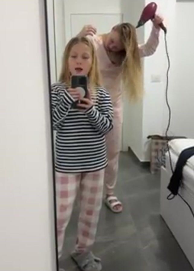Two people are visible in the video, standing in a bathroom. A blonde-haired young girl in a striped long-sleeved shirt and pink plaid pajama pants takes a selfie in the mirror. She is wearing gray fuzzy slippers. Behind her is a blonde-haired woman in pink polka-dot pajamas and white sandals. She is using a red hair dryer to dry her hair. The room is white with gray tiled floors. A bed with a black shirt on it is visible in the background. There is also a shopping bag near the bed.