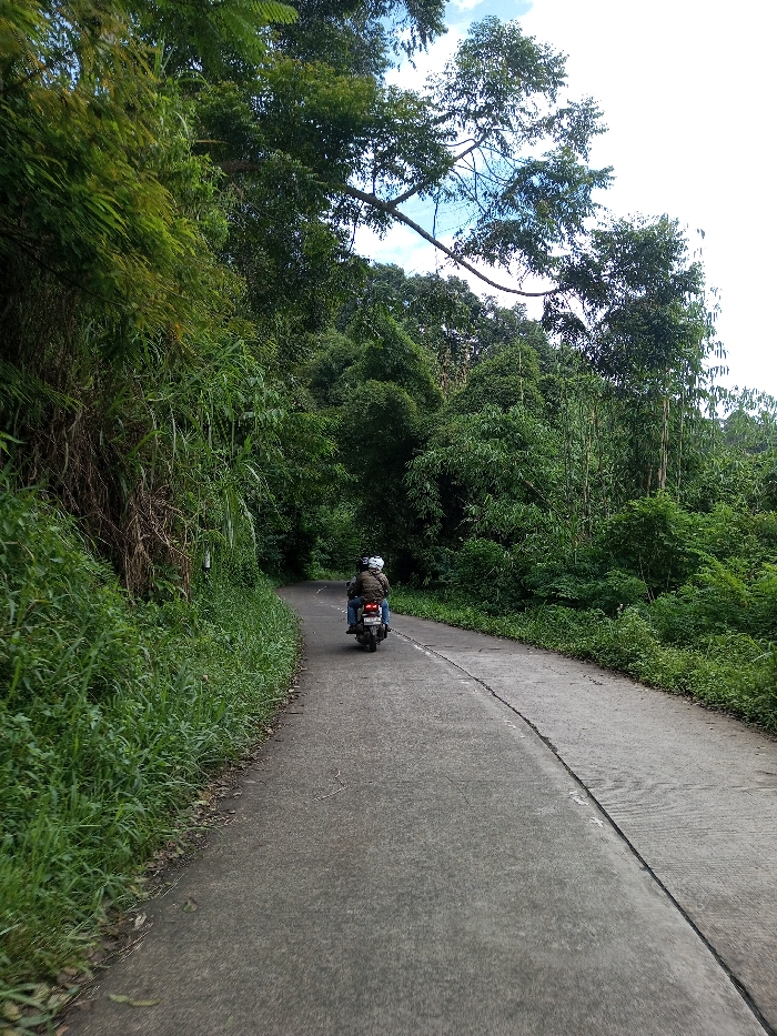 This image depicts a rural road in Ariyalai, Sri Lanka, surrounded by dense tropical vegetation. A dark-colored scooter, carrying two individuals, travels away from the viewer along the paved road. The driver wears a dark jacket and a light-colored helmet, with a passenger behind also wearing a light helmet and dark clothing. The road exhibits a longitudinal seam or crack and curves to the left in the distance. On the left side, tall green grass and foliage line a steep embankment. The right side of the road is bordered by an equally dense wall of trees and bushes. Overhead, a partially visible sky is overcast with patches of lighter blue. The overall environment is lush and green, characteristic of a tropical or subtropical forest setting.