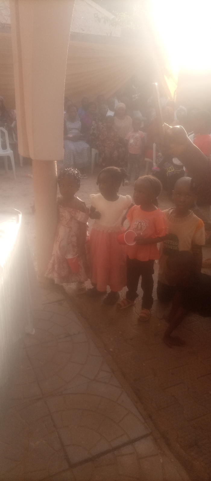 An outdoor scene in Sabon Tasha, Nigeria, depicts a gathering under a light-colored fabric canopy
