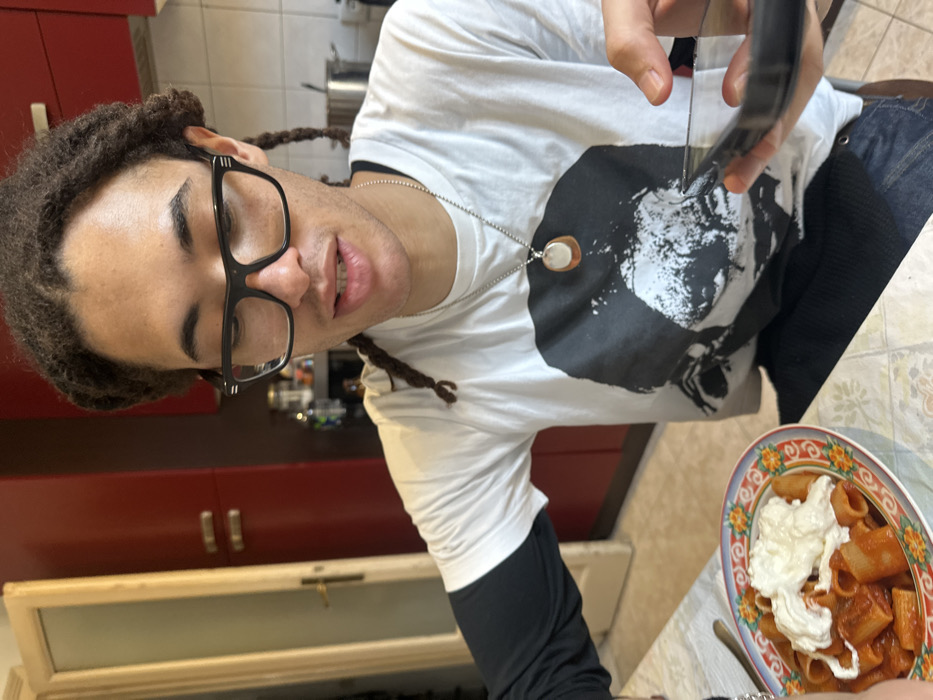 A young adult male with dark dreadlocks and black-rimmed glasses is depicted seated at a light-colored patterned table, likely in a kitchen or dining area, in Milan, Italy