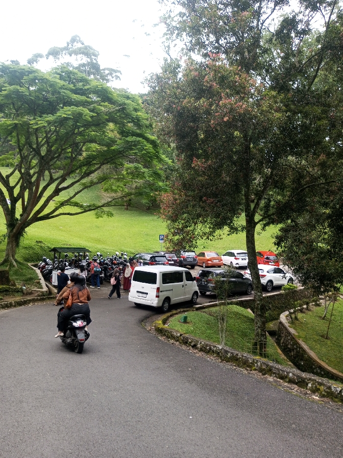 The image depicts an outdoor recreational area or park in Padegaon, India. A paved asphalt road curves through the scene, leading to a multi-modal vehicle parking facility. In the foreground, a dark-colored scooter with two occupants, both facing away, travels on the road. To the left, a designated motorcycle parking area contains dozens of scooters and motorcycles beneath a green-roofed shelter. Adjacent to this, a car parking lot holds approximately ten vehicles, including a white minivan, a dark grey SUV, an orange sedan, a white hatchback, and a red sedan. A blue "P" parking sign on a pole marks the car parking area. A group of approximately 10-15 pedestrians, some wearing head coverings, are observed walking and standing within the parking areas, primarily between the motorcycle and car sections. The surrounding environment consists of rolling green grassy slopes and numerous mature trees, with a large, wide-branched tree prominent on the left. The sky is overcast. A stone-lined drainage channel parallels the road on the right.