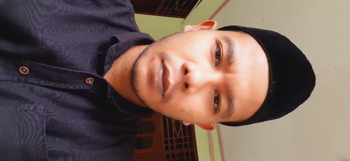 A male individual is depicted in a head-and-shoulders portrait, centrally positioned. He is a young adult with medium-brown skin, dark eyes, and a neutral facial expression, looking directly at the camera. He has light stubble on his chin and upper lip. He wears a black velvet peci/kopiah and a dark-colored (likely navy or black) long-sleeved collared shirt with the top two buttons unfastened. A breast pocket is visible on the left side of his shirt. The background features an interior wall with two distinct color sections: a lighter, possibly off-white or pale beige, upper portion, and a light green lower portion, separated by a horizontal line. To the subject's right, a dark wooden window or door frame with horizontal panels is visible. The scene is situated in Lhokseumawe, Indonesia.