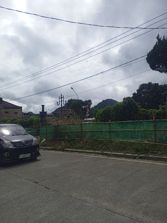 A black car is parked on the left side of a grey asphalt road. Behind the car is a green netting fence, with overgrown vegetation between the fence and the road. A building is partially visible to the left of the fence. Beyond the fence, there is a flagpole flying an Indonesian flag. Hills rise in the background beneath a cloudy sky crisscrossed with power lines. A tall tree is on the upper right.