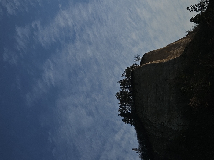 The image displays a prominent, eroded geological formation within the city of Melnik, Bulgaria, characterized by a steep cliff face. The formation rises from the lower left, extending across the mid-frame. Its left and central sections are heavily shadowed, appearing in dark brown and grey tones, while a distinct vertical segment on the right is brightly illuminated by direct sunlight, showcasing a lighter sandy-ochre hue. The crest of the shadowed cliff is adorned with a dense cluster of dark, coniferous trees, consistent with pines. A solitary, leafless deciduous tree stands atop the highest illuminated point of the formation. The base of the cliff and the immediate foreground are obscured by deep shadows cast by dense vegetation. The upper two-thirds of the frame feature a clear blue sky, sparsely covered with thin, wispy white clouds. The lighting conditions indicate a low sun angle. No individuals, animals, or man-made objects are visible.