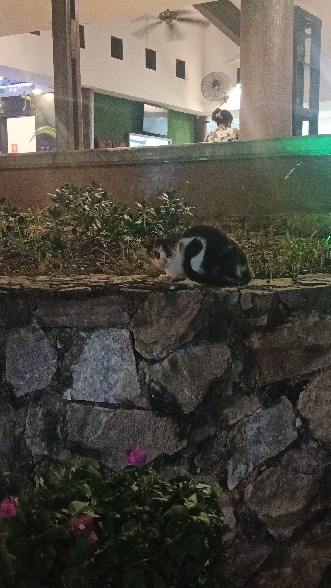black and white cat sitting on a stone wall. Behind the cat is a row of green plants. Below the wall is another cluster of green plants with pink flowers. In the background, a partially visible building with lights, columns, and a ceiling fan can be seen. A person is standing behind the building's edge. The location is possibly Playa El Agua, Venezuela, based on image context.