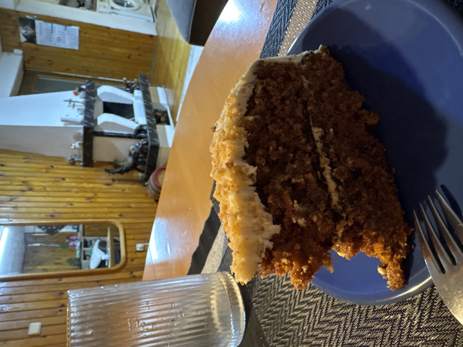 The image depicts an indoor scene, specified as being in the city of Stefan Karadja, Bulgaria. In the immediate foreground, a slice of carrot cake rests on a blue ceramic plate. The cake exhibits two distinct layers of brown cake and two layers of white cream cheese frosting, with the top layer of frosting covered in light-colored crumbs. A silver fork is positioned on the plate at the bottom-left. The plate sits on a dark placemat featuring a chevron pattern. To the left of the cake, a clear, vertically ribbed glass is partially visible on the placemat. Behind the placemat and glass, a light brown wooden table surface extends into the background. The background features a room with walls paneled in light brown wood. On the left wall, a wooden-framed mirror reflects a section of the room, including shelves with various objects. Towards the center-right, a decorative fireplace structure is visible, constructed with light-colored elements and a darker hearth. The mantelpiece holds several small decorative items, including dark animal figurines. Further right, a doorway opens to another area where a white washing machine is partially visible. The floor throughout the visible background is covered with light-colored wooden planks. A dark gray cushion or part of a sofa is situated on the far right. A light-colored calendar or poster hangs on the wall to the right of the fireplace. No individuals are present in the scene.