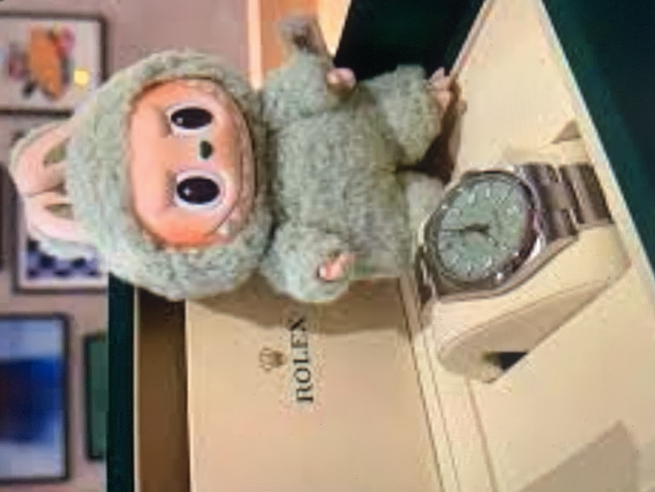 - "An indoor scene in Al-Mazza Municipality, Syria, displays a light green, furry plush toy positioned adjacent to an open Rolex watch box" by FM-q7EDs2, licensed under CC BY 4.0