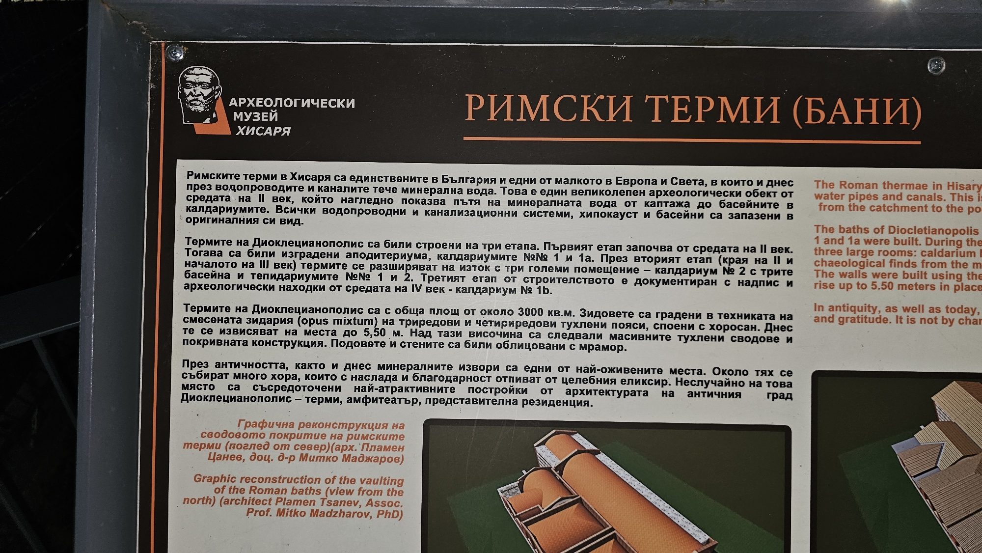sign in Bulgarian and English about the Roman Baths in Hisarya, Bulgaria