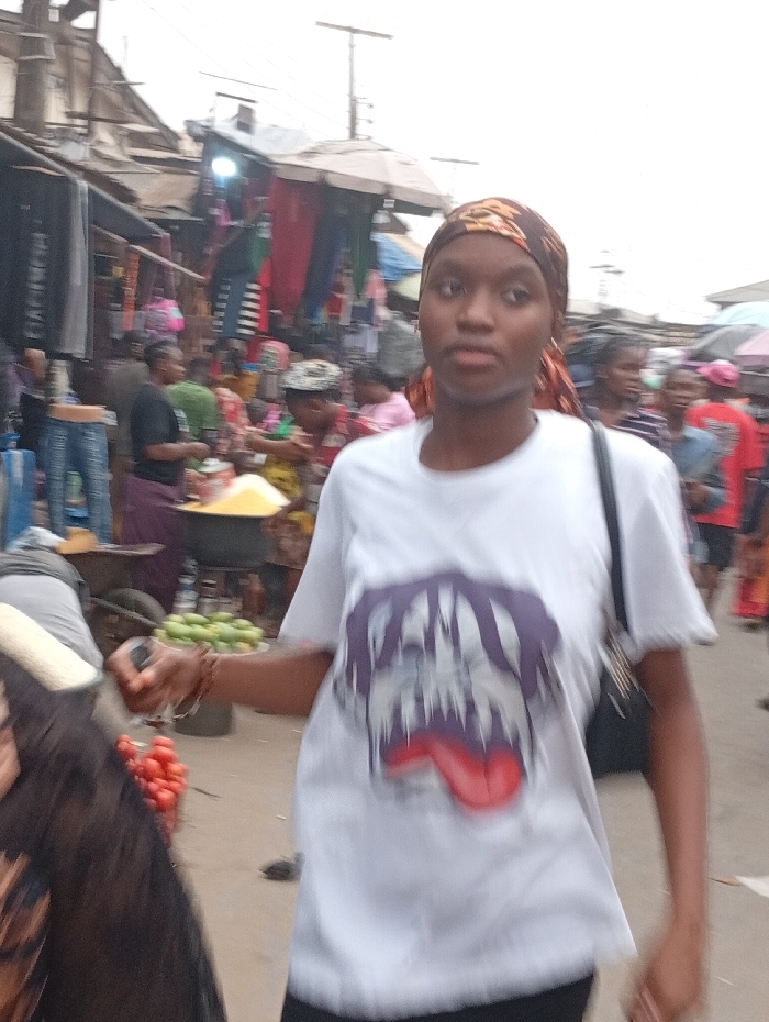 A young woman with a headscarf stands in a bustling outdoor market. She wears a white t-shirt with a bold graphic and a black bag slung over her shoulder. The market behind her is filled with people, stalls selling various goods, and overhead structures providing shade. Tomatoes and a plate of green produce are visible near her, suggesting food vendors are nearby. The scene is busy and captures the essence of a vibrant marketplace.
