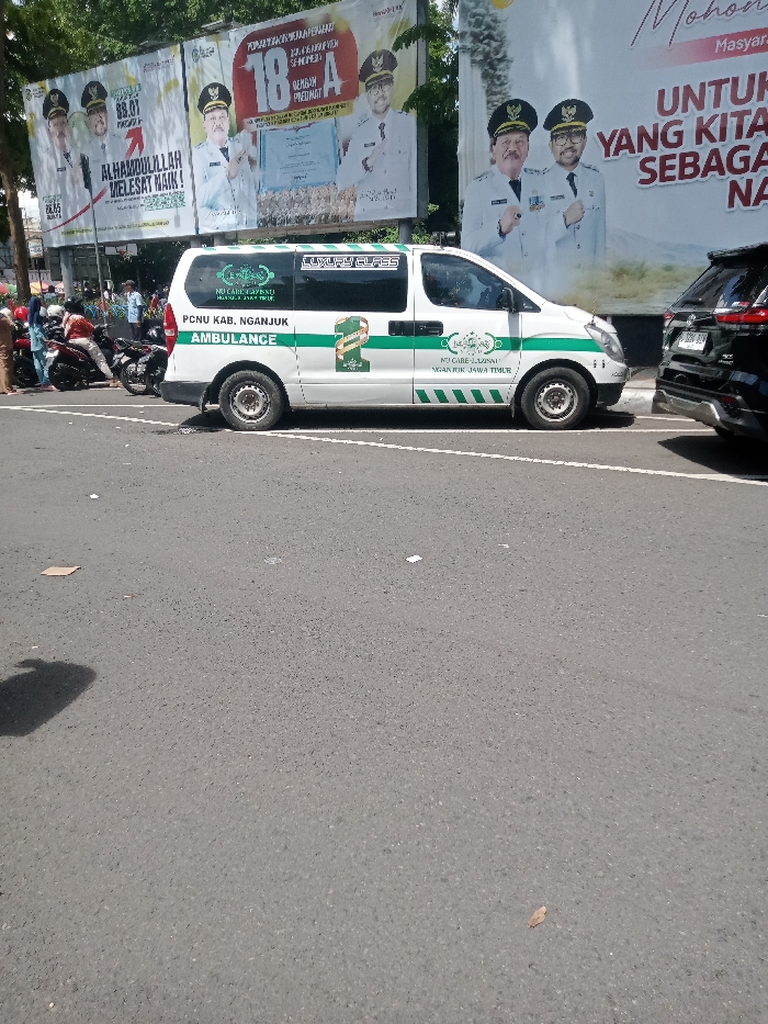 The image depicts a daytime street scene in Nganjuk Regency, East Java, Indonesia. In the foreground, a dry asphalt road with a visible white line features scattered small debris and a dark, indistinct shadow on the left. A white van, clearly marked as an "AMBULANCE" for "PCNU KAB. NGANJUK" and "NU CARE-LAZISNU NGANJUK JAWA TIMUR LUXURY CLASS" with green decals and the Nahdlatul Ulama (NU) logo, is parked on the right side of the road. To the immediate right and slightly behind the ambulance, the rear bumper and wheel of a black SUV are partially visible. On the far left, a small group of individuals, some wearing headscarves, are standing near multiple parked motorcycles. In the background, three large billboards are prominent, each displaying images of uniformed men, likely local officials, alongside text in Indonesian. Green tree foliage is visible above and between the billboards.
