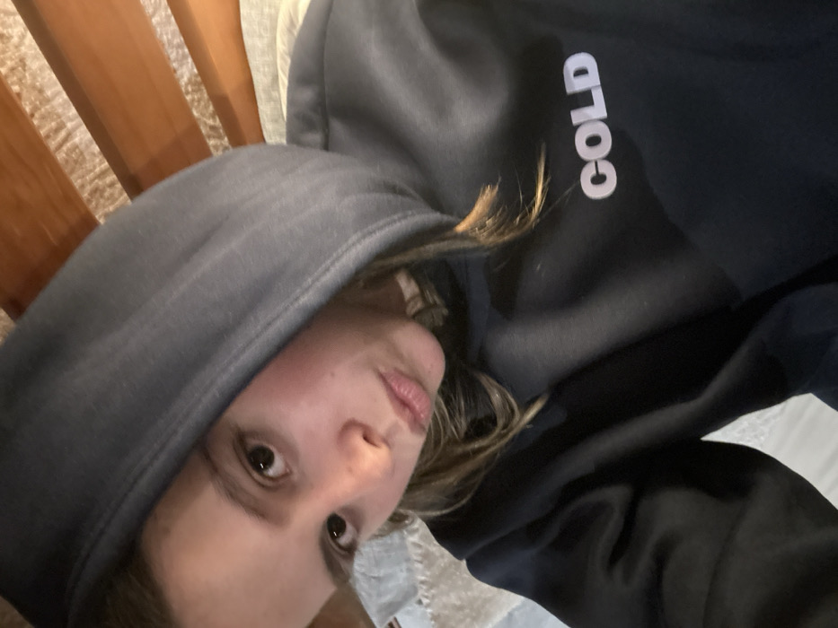 A person in a hoodie with the hood up looks at the camera. The hoodie is dark blue with the word "COLD" in white letters. Brown hair peeks out from under the hood. A light-colored wooden frame is visible in the background, possibly a chair. The image appears to be taken from a slightly angled, close-up perspective.