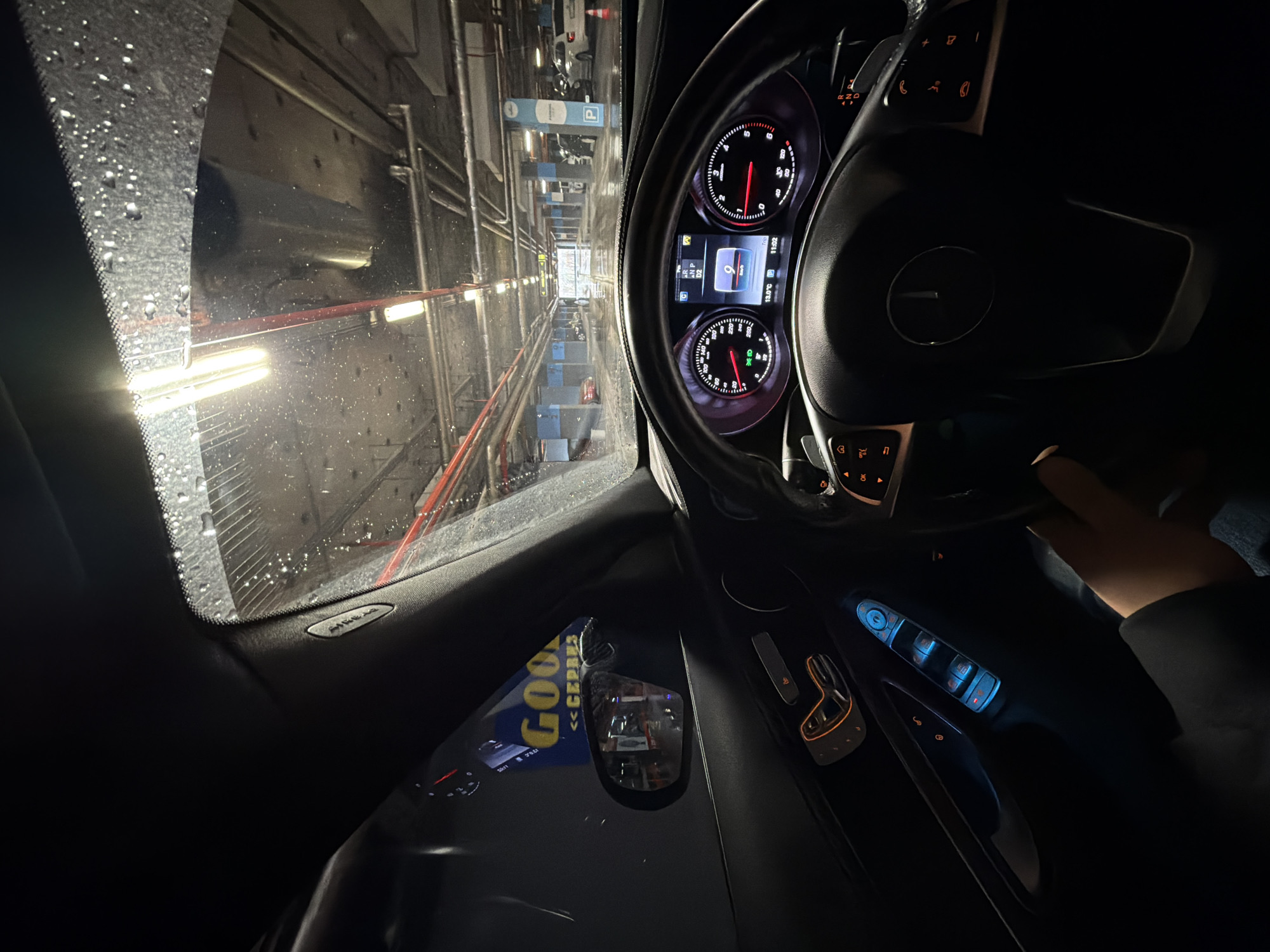 The image depicts a driver's perspective from inside a Mercedes-Benz vehicle within a multi-story parking garage in Burgas, Bulgaria. The time is 11:02, and the exterior temperature is 13.0°C. The car is moving at 9 km/h, indicated by the instrument cluster which displays a digital speedometer, tachometer, and gear selector showing "D2". A right hand, presumably the driver's, is visible gripping the lower-right portion of the black, leather-wrapped steering wheel, which features the Mercedes-Benz logo and illuminated multifunction controls. The driver's door panel is visible on the left, displaying illuminated blue controls for windows and orange-backlit seat adjustment buttons. The A-pillar trim on the upper left bears an "AIRBAG" inscription. The windshield is speckled with water droplets, reflecting bright overhead fluorescent lights that illuminate the concrete ceiling of the parking structure. Exposed utility pipes, some red, run across the ceiling. Through the windshield, a long aisle of the parking garage is visible, lined with concrete pillars, some painted blue with white "P" (parking) symbols. Other parked vehicles, including a red car on the left and several white cars on the right, are visible further down the aisle. The concrete floor of the garage appears wet in sections. The left side mirror reflects a prominent blue and yellow "Goodyear" sign with Cyrillic text, likely "СЕРВИЗ" (Service), indicating the proximity of a car service center or tire shop within or adjacent to the parking facility.