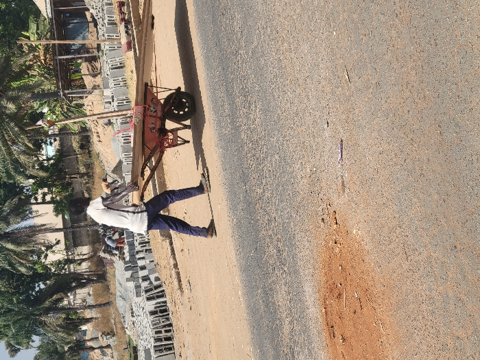 The image depicts an outdoor scene in Kwamba, Nigeria, characterized by a construction material handling operation. In the foreground, a dark-skinned male, appearing to be a young adult, is shown in profile moving from right to left. He wears a short-sleeved white t-shirt, dark blue trousers, and light-colored sandals. He is actively pushing a single-wheeled, red-painted wheelbarrow, which has been modified with an extended wooden platform to transport several long wooden planks or beams. These planks are secured to the wheelbarrow frame with red rope. The ground immediately in front of the individual is a paved asphalt road, exhibiting scattered debris and a distinct patch of reddish-brown dirt on its surface towards the bottom left. To the left of the paved road, a dirt shoulder or unpaved area leads to a large, open-air storage or manufacturing site. This site contains numerous stacks of grey rectangular concrete blocks, indicating building material production or distribution. In the background of this area, several other individuals are visible, engaged in tasks near the block stacks. Further into the background, a dense array of tropical vegetation, primarily tall palm trees, rises above the construction site. Various structures are interspersed within the scene; to the far right, an open-sided shelter with a wooden frame and a simple roof is visible. Additional buildings, some appearing residential, are discernible through the foliage in the distant background. The scene is illuminated by natural daylight, suggesting clear weather conditions.