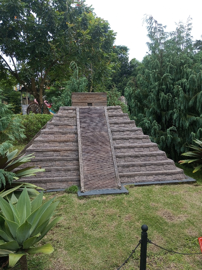 This image depicts an outdoor recreational or exhibition area in Pacet, Indonesia. The primary subject is a miniature, stepped pyramid structure, centrally positioned. This replica is constructed from brown-grey material simulating stacked stone blocks, featuring multiple receding tiers. A central, steep ramp or stairway composed of horizontal wooden slats ascends from the base to a small, rectangular block-like structure at the pyramid's apex. The pyramid rests on a mown green lawn, bordered by a dark-colored strip at its immediate base. To the lower left, a large succulent plant with thick, pointed green leaves is prominent. The background is dominated by dense, green foliage, including tall trees with cascading branches on the right and broadleaf trees on the left. In the upper left background, partially obscured, a distant structure resembling a kiosk with a red roof, a large wooden wheel, and colorful elements is visible. In the lower right foreground, a black metal post with a taut black rope forms part of a barrier. The scene is illuminated by diffused daylight, indicating an overcast sky. No individuals are present.