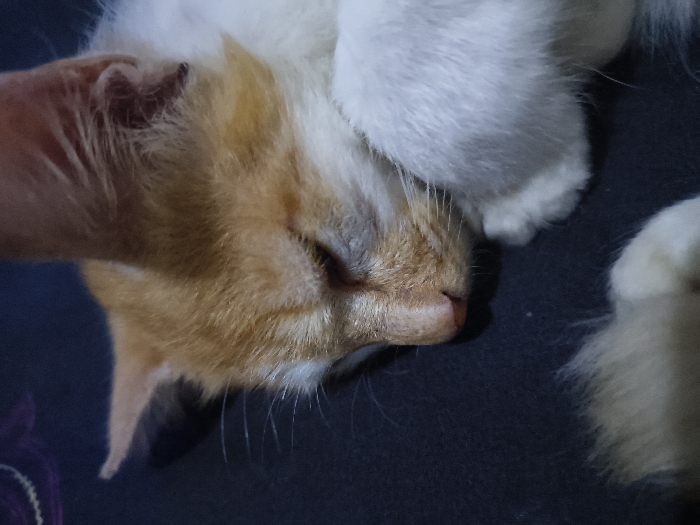 A close-up captures a sleeping cat. The cat's fur is a mix of orange and white. The cat's face is partly covered by its white paws, obscuring one eye. The background is a dark, textured surface. The ear is visible in the upper left. The cat's nose is pink.