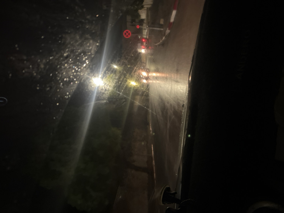 A nighttime scene from inside a vehicle shows a rainy windshield obscuring the view