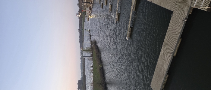The image displays a waterfront scene in Venlo, Netherlands, captured during twilight hours. The primary subject is a large body of water, likely a river or canal, characterized by dark, rippled surfaces. In the immediate foreground, a grey, L-shaped floating dock extends from the lower left towards the mid-right. Further into the frame on the right side, a series of parallel floating docks create multiple empty boat slips. The left bank of the waterway features a narrow strip of grassy land with sparse vegetation. Several brown, vertical mooring posts are visible in the water along this bank and extending into the middle distance. On the far side of the water, a wider section of the waterway is visible to the left, while the right bank displays multiple buildings with illuminated windows and signage. Distinct navigational markers include a green-topped pole in the mid-ground and several red-and-white striped posts along the far right bank. The sky above is a gradient of light blue transitioning to pale pink near the horizon. No individuals, vessels, or active interactions are present in the scene.