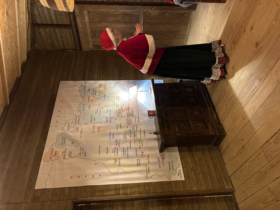 The scene is an indoor room in Castellar del Vallès, Spain, featuring walls constructed from horizontal dark wooden planks and a light wooden plank floor. A large, unframed map of Catalonia is affixed to the left wooden wall, displaying regional divisions and bordering areas including France, Andorra, Aragon, and Valencia. Below the map, a dark, ornately carved wooden console table supports a white-shaded table lamp, a red mug with white snowflake motifs, a small brass-colored bell, and a dark bottle. An adult individual, likely female, with short light-colored hair and spectacles, stands right of center. They are dressed in a festive ensemble comprising a red Santa hat with a white brim, a red cape with white fur trim worn over a white collar, a long dark green velvet skirt, and white athletic shoes. The skirt's hem is adorned with white lace over a red and green plaid ruffle. The individual faces right, with hands held together or clasped in front of their chest, suggesting an expressive gesture toward an unseen subject to the right. The room is lit by the table lamp and a woven pendant light fixture visible in the upper right corner. A dark wooden door is visible on the far right wall.