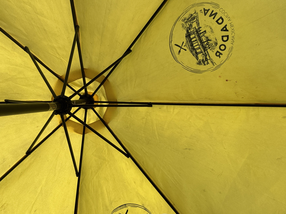 The image displays the underside of a bright yellow outdoor umbrella. A central black pole ascends through the center, from which multiple black metal ribs extend radially to support the canopy. The yellow fabric shows minor creases and faint surface discoloration. In the lower right quadrant, a circular black logo is printed, appearing reversed due to the perspective. The logo depicts a detailed illustration of a multi-tiered building, resembling a gazebo or kiosk, surrounded by foliage. Above the building, a crossed fork and knife icon is visible. Below the illustration, the curved text "EL ANDADOR COCINA MEXICANA" is printed, also mirrored. This umbrella is associated with the restaurant El Andador Cocina Mexicana, located in Zacatlán de las Manzanas, Puebla, Mexico.