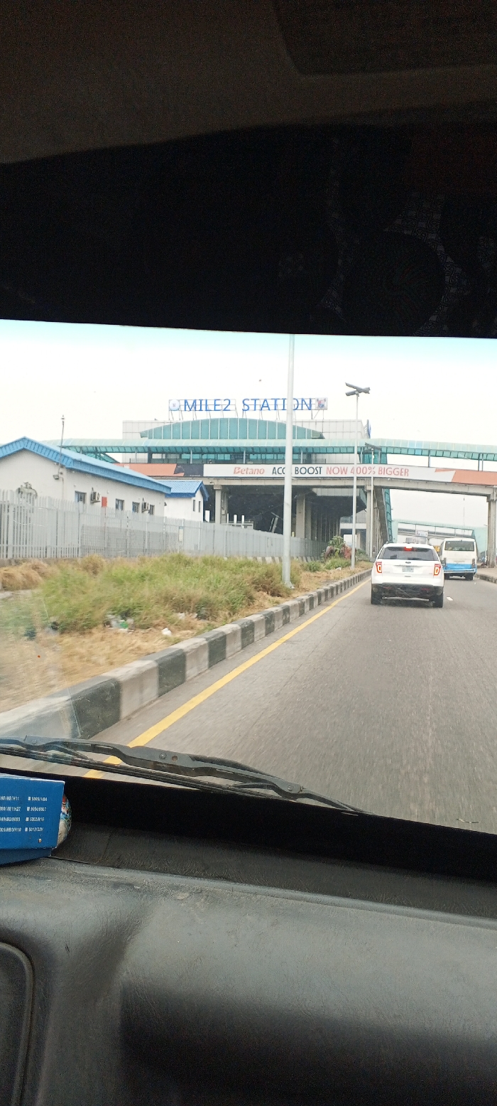 The image captures a forward-facing view from inside a vehicle, revealing a roadway scene at Mile 2 Station, Lagos, Nigeria