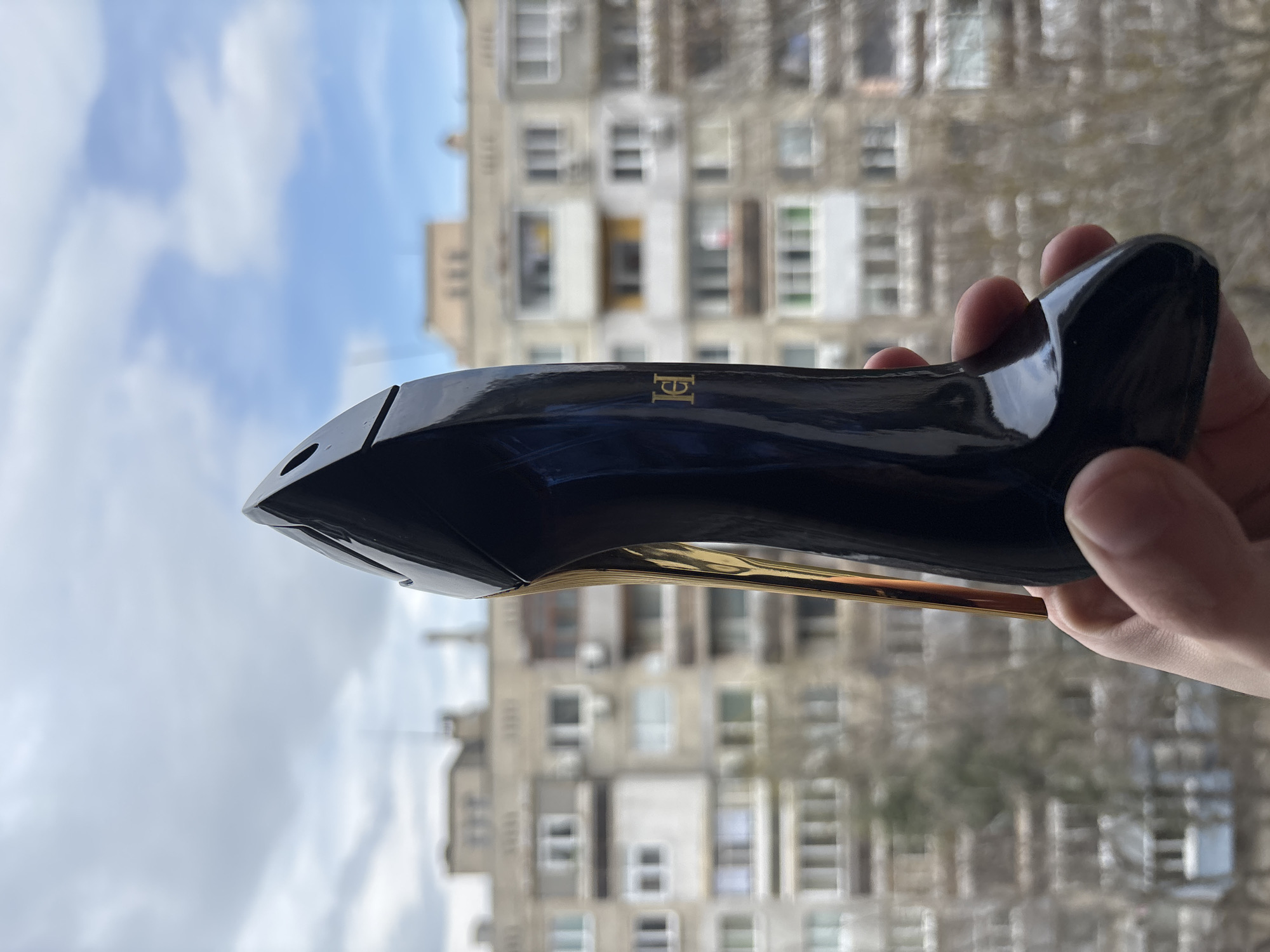 A human hand, likely a right hand, holds a glossy black perfume bottle shaped like a high-heel stiletto shoe