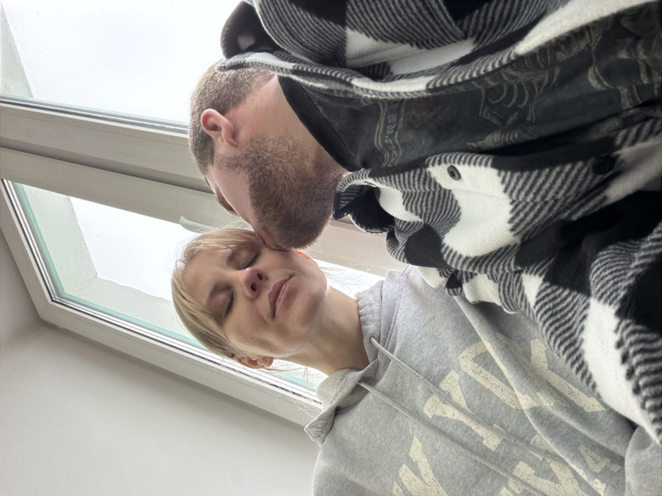 An indoor scene in Vereshchagino, Russia, depicts two individuals in a close embrace. A female, with light blonde hair and closed eyes, wears a grey hooded sweatshirt featuring faded light-colored lettering. Her right cheek is pressed against the left cheek of a male, who has a light-brown beard and is wearing a black and white plaid shirt over a dark t-shirt with a graphic design. Both individuals are positioned in front of a large, multi-pane window with white framing, through which an overcast sky is visible, illuminating the scene. The window's sealing or gaskets display a faint green tint. A light-colored wall is visible to the upper left. The interaction suggests an affectionate gesture. The exact location within Vereshchagino is not discernible beyond it being an interior space with a window.
