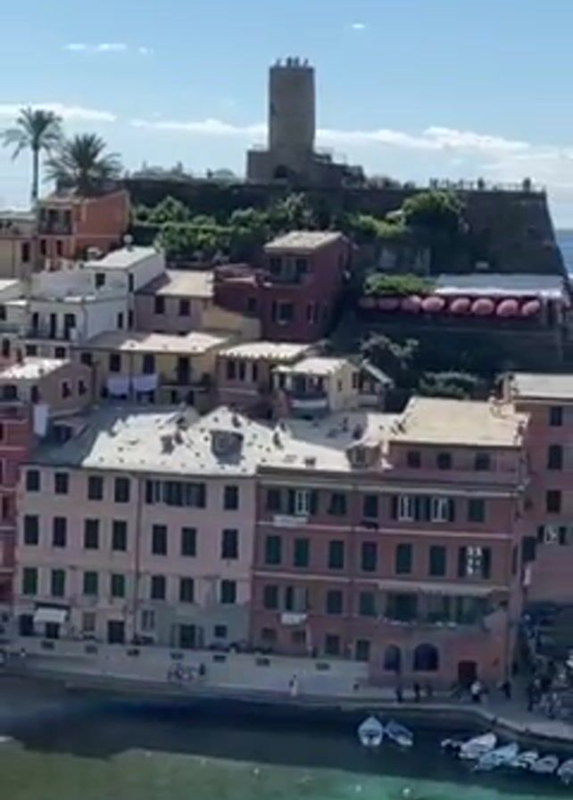 The video reveals a picturesque coastal town nestled on a rocky promontory, overlooking a small harbor dotted with boats